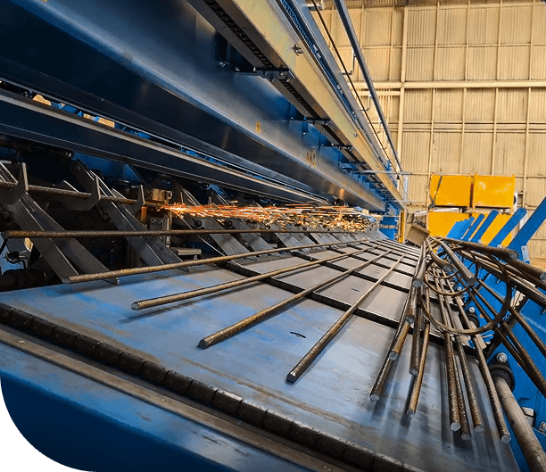 Manufacturing data is digitally transmitted to the production line, where a fully automated system welds the bars precisely according to the specified plan, ensuring accurate distances and positions on the assembly lines, resulting in dimensionally precise reinforcement elements.